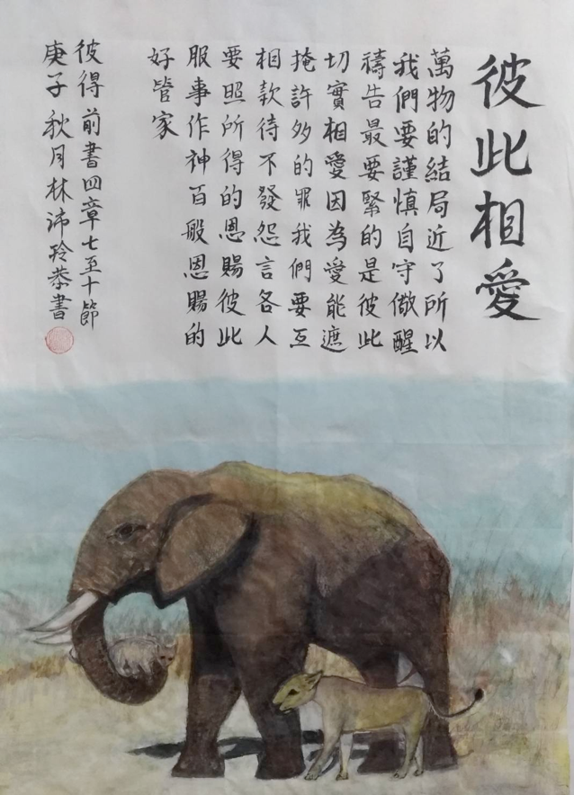一隻幼獅在炎熱的大草原上已經無法再行走了,母獅也無能為力。一隻大象經過,用長鼻子摟起幼獅,與母獅同行,帶著牠到水邊。拍攝的原圖(大象與獅子),據說是2020年最溫馨的相片,所以我也把它用彩墨國畫畫下來。動物之間的彼此相愛令人感動,而各位基甸會兄姊,發揮愛心傳揚福音的美事,更是造就了許多同胞,改變了他們的一生,而我就是其中之一。