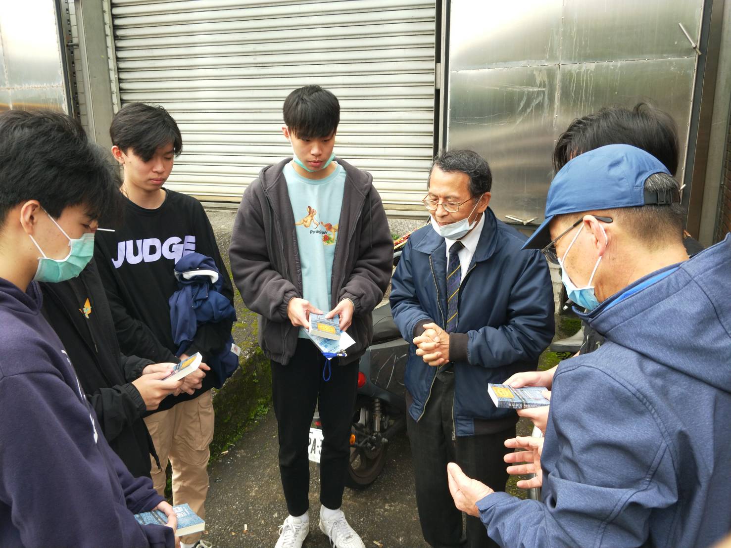 在我們結束贈送聖經的時候,我們向神獻上感謝的禱告。我們走向停機車的地方,邊走邊談論神如何的恩待我們,我們讚美的話還沒講完,這時候奇妙的事發生了。有一群學生大概7位,他們主動請我們為他們將來的學校來禱告。於是我們和學生們就為一個圓圈,一起低頭為他們將來的學校禱告,求主帶領他們一生的道路。主啊,我們感謝你,你賜給我們這樣的機會向他們來傳揚福音,引領他們來認識你,我們相信有一天他們必定要來歸向你,你也必引領他們一生的道路。
