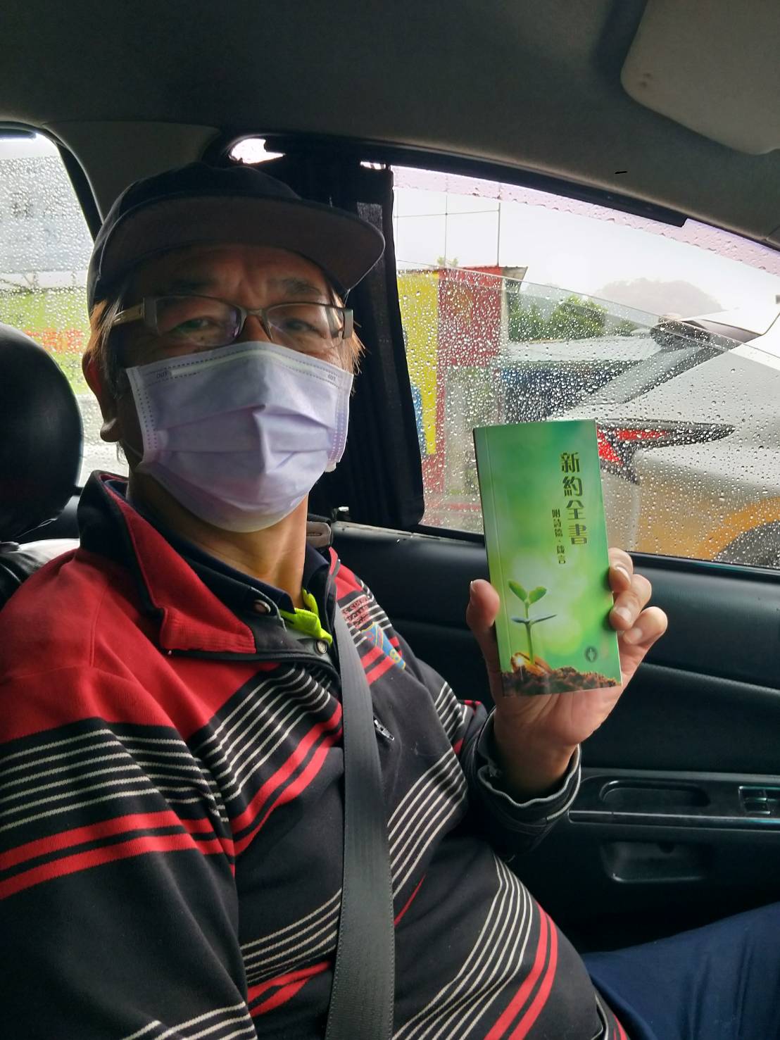 我跟他説,我講一個跟『旅館』有關的故事:「很久以前在美國旅行商人因為長年外出經商,常常投宿在旅館。在120多年前,有兩位商人因為投宿的旅館只剩一間兩張床的房間。他們只好共用一個房間。到了晚上,旅館中充滿了各樣的誘惑,空氣中充滿濃濃菸味、地上躺著酒醉旅客、一旁還有兩桌賭局正在進行的大廳裡。其中一位商人想要讀聖經,因為他有答應他的母親每天都要讀聖經,他問另外一位是不是會打擾到他,結果那一位很高興的跳起來說,我也是基督徒,我也想跟你一起讀。那晚,他們講論著身為基督徒旅行商人,在生活中常見的試探,以及如同這個晚上他們所經歷到的一般,有肢體彼此扶持、提醒、禱告、團契的需要。他們知道旅行商人不方便帶著厚重的聖經外出,所以他們在隔年就成立了基甸會,在各旅館的櫃檯放一本聖經,給旅行商人的基督徒借用。後來就延伸到現在,每一間旅館、飯店,各房間都會放一本聖經。」然後我也講到我自己在金門的垃圾桶中撿到基甸會的聖經而信主的經歷。 我跟他説,今天是帶媽媽一起來參加基甸會與教會牧師的餐會。很奇妙,司機大哥聽到『基甸會』、『教會』、『牧師』,他的心好像突然醒悟過來,打開了他少年時代的記憶。在音樂中回想起他少年時代的生活。他説他的母親一直都在宜蘭的教會醫院的裁縫部工作到65歲,他自己也常參加教會聚會,參加洗禮、節期,但是現在已沒有去教會了。於是我打開背包拿出基甸會的聖經送給他,鼓勵他在排班的時候可以打開來讀,希望他能再回到教會。