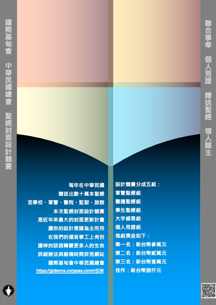 2. 線上報名:請至本會網站https://gideons.corpaas.com/r/jCM填寫表單直接報名,並於截止時間前將作品及參賽切結書(如附件一),簽名後以掃描檔或圖片檔呈現,主旨標記「聖經封面設計」並標明組別,一同寄至信箱[email protected]