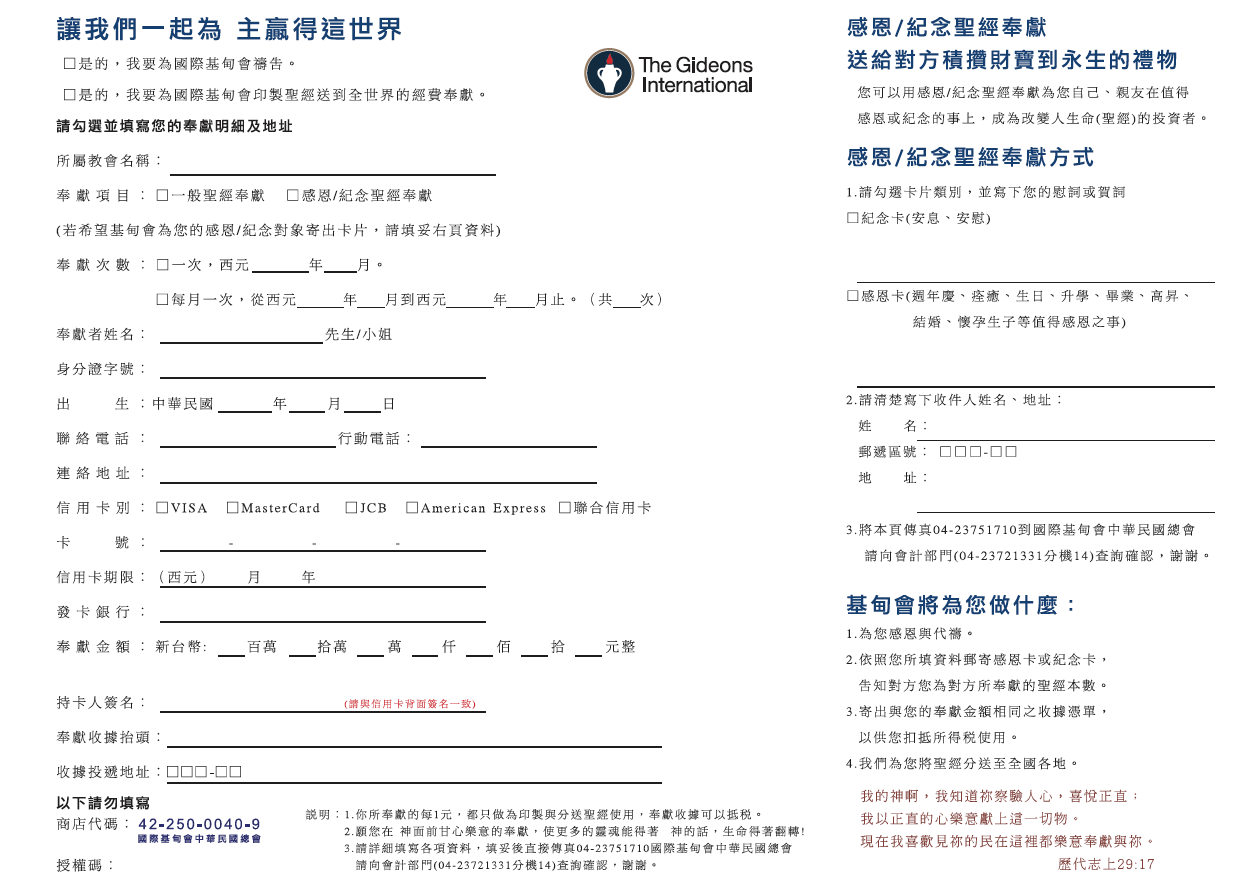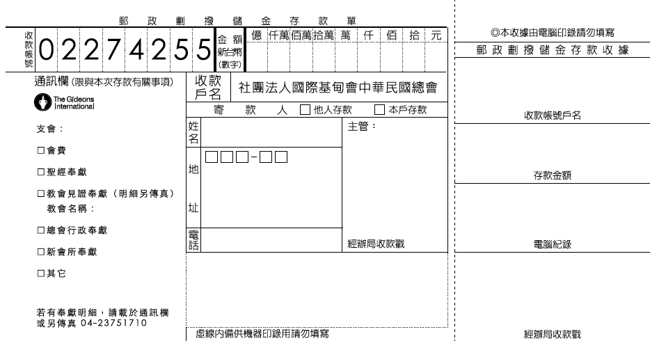 請將電匯單及奉獻明細傳真本會以利入帳)